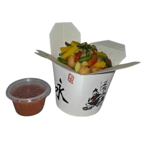 Nasi krokante kip, paprika,courgette,boontjes, uimet zoetzure saus